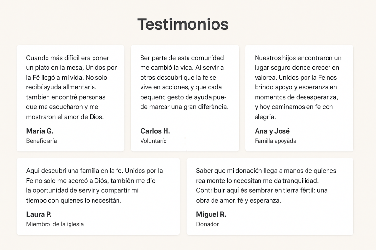 Unidos por la Fe nació del deseo profundo de servir a Dios y de llevar esperanza a las personas y familias que enfrentan dificultades. Con la guÃa de su amor, hemos construido una comunidad solidaria donde cada acción refleja la compasión y la bondad divina. Nuestra historia es la de un pueblo que camina unido, confiando en que la fe es la fuerza que transforma corazones y que impulsa obras de ayuda humanitaria en favor de quienes más lo necesitan.